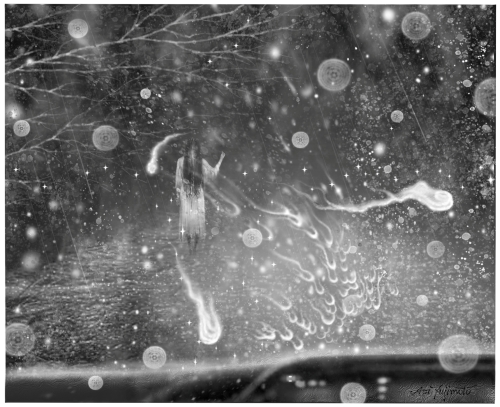![]() 2.峠の中腹まで来たときのこと、トラックの前方に人影を認めました。白いワンピース姿の若い女性が、濡れながら手を上げています。まるで乗せてほしいといっているようでした。一瞬、迷ったものの、人家もない峠道で、しかも丑三つ時。あやかしに違いないと思いなおした父は、女性を無視して車を走らせました。 |