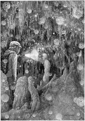 ![]() 3.しばらくして目を開けたところ、数人の男女が顔をそろえて夫を覗きこんでいます。その中のひとりの老人が杖を持っていて、あろうことかその杖で夫の頭を小突いたそうです。恐怖のあまり気絶した夫は、そのまま朝を迎えました。 |